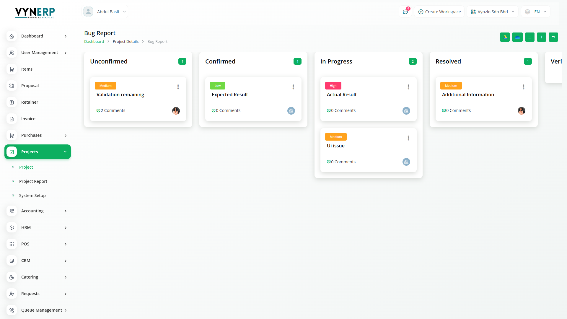 Create new bugs and assign users and priority to them. You can write a note in the text box for the bug description. Also, the status of each bug could be changed through an easy drop-down and Kanban drag system.